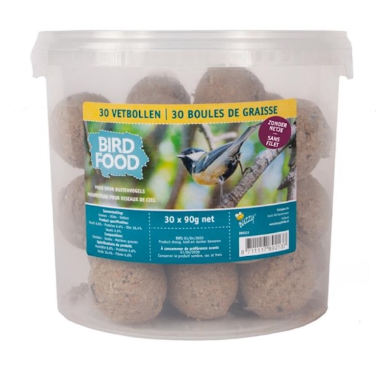 30 stuks per emmer. Deze vetbollen van Bird zijn gemaakt met hoogwaardige ingrediënten van niervet met een mix van granen en zaden. Granen en zaden zijn rijk aan vezels, eiwitten en vitamine B en de vetbollen bevatten ook vitamine E en mineralen. Zonder netje!
