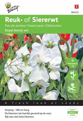 De siererwten uit de 'Royal Family' reeks behoren tot de heerlijk geurende eenjarige Lathyrus typen. Ze bloeien zeer vroeg en geven een lange dikke bloemsteel met veel grote, witte bloemen. Uitstekende snijbloemen. De planten worden tegen een klimsteun gemakkelijk 2 meter hoog. Na opkomst uitdunnen of op de definitieve plaats uitplanten. Regelmatig water geven.